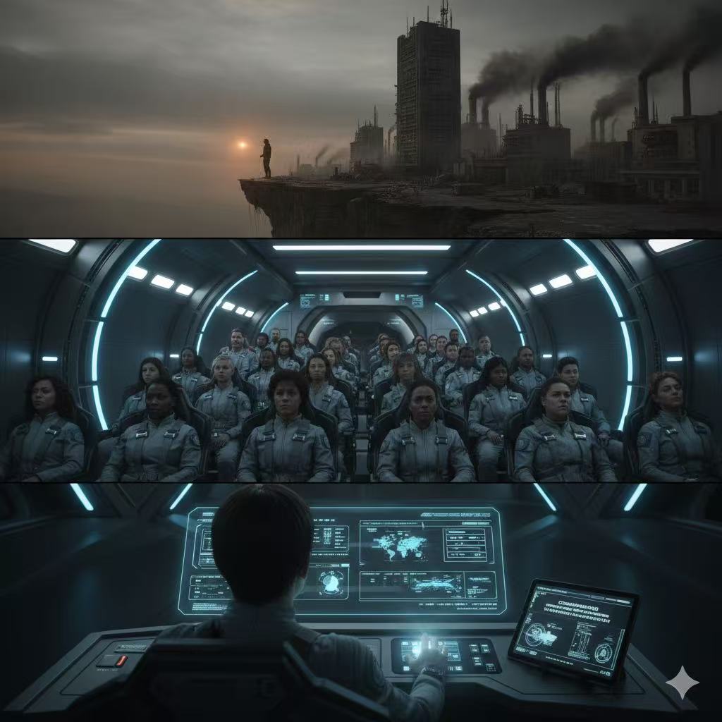 我是在自愿名单上签字的那一批人。登船那天,空气依旧混浊,吸进肺里带着颗粒感的沉闷。起飞场外,远处的城市像一具衰老的机械,高楼的玻璃幕墙早已失去光泽,街道上没有往日的车流,只有偶尔闪过的人影,运转缓慢而沉默。我没有回头看太久,背包里只装着一张家人的新合影——他们没能等到迁徙的机会,只能留在这颗日渐枯萎的星球上。与我同行的一百多人脸上都带着同样复杂的表情:期待、不安、解脱,或许还有对地球最后的愧疚——我们终究是放弃了它。